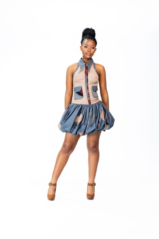 Denim & Shweshwe Fusion Ensemble, Sleeveless with a dramatic open-back train, fitted bodice with a flared peplum hem. Elegant yet edgy; perfect for events, fashion showcases, or high-impact street style
