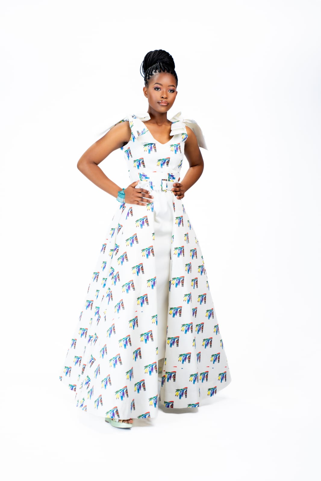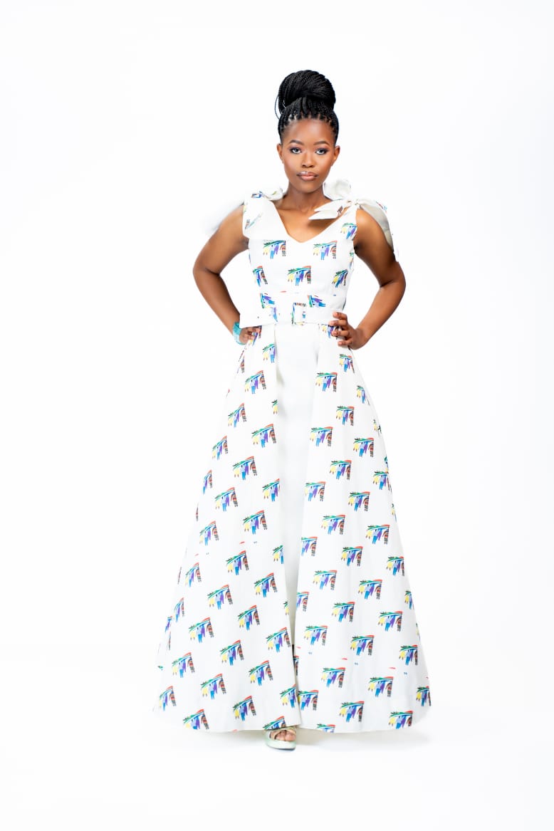 contemporary African sophistication. This two-piece set features an A-line dress paired with a