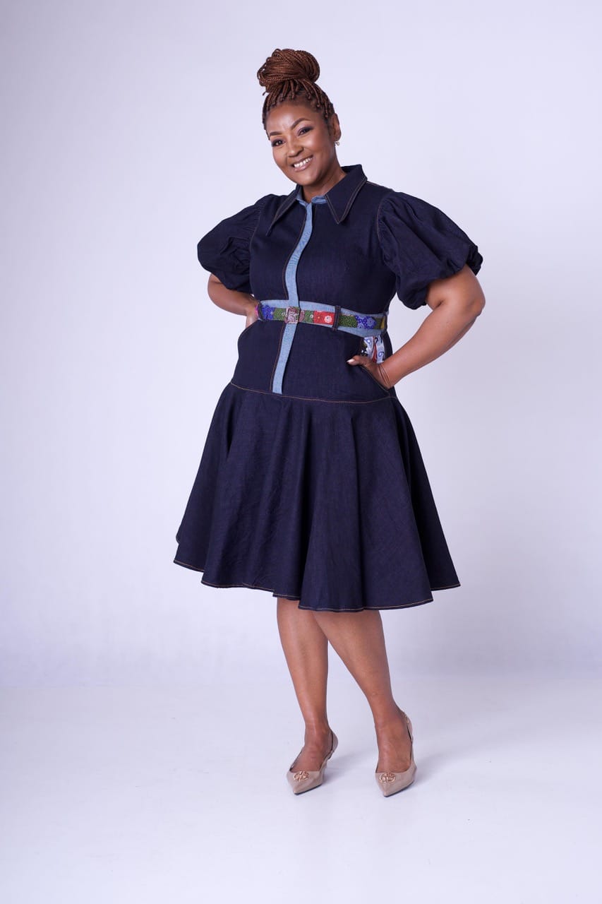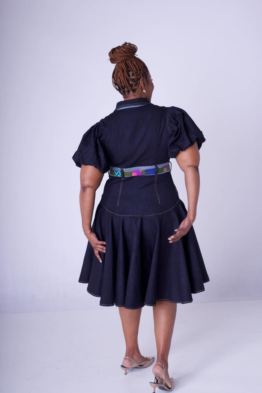 Low waist dress that offers a polished yet casual aesthetic with a front zipper, puffed short sleeves, and a belt.