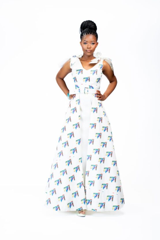 movement. This floor-length gown features an off-shoulder neckline adorned with a delicate gathered